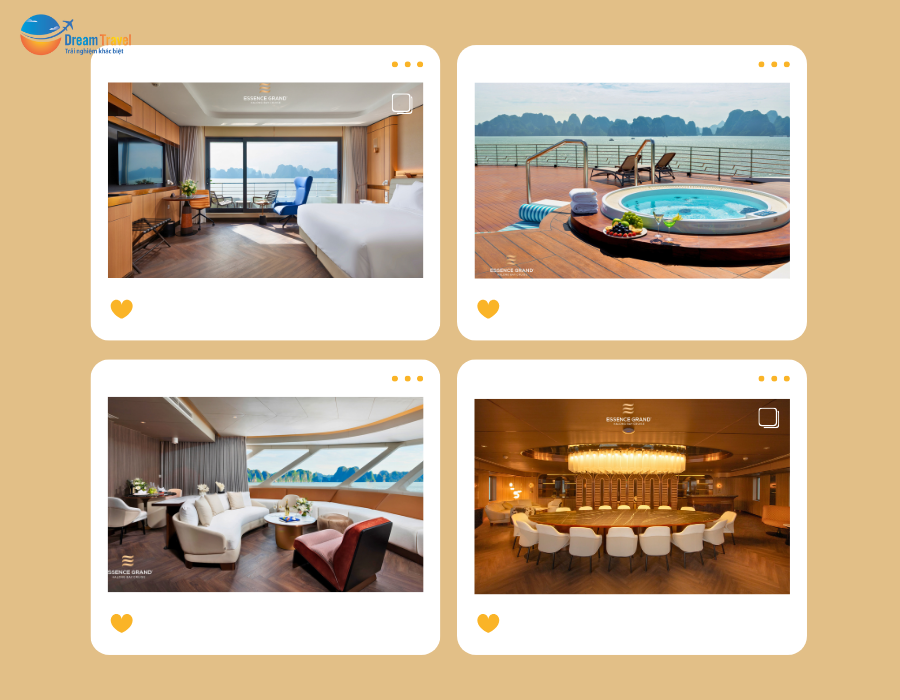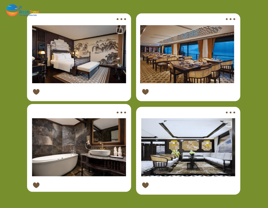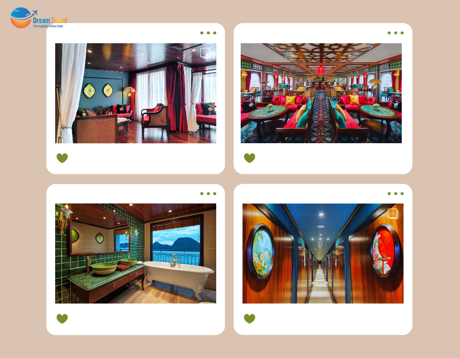 • Thiết kế hiện đại, sang trọng: Du thuyền được thiết kế theo phong cách hiện đại, kết hợp hài hòa giữa nét truyền thống và đương đại. Các cabin được trang bị đầy đủ tiện nghi, mang đến không gian nghỉ ngơi thoải mái và riêng tư.