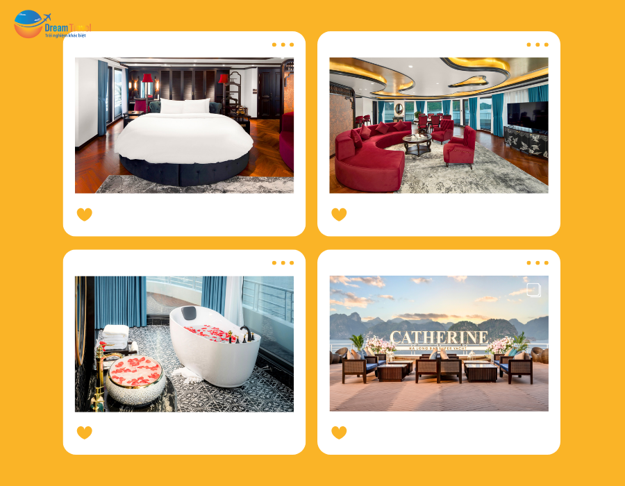 • Siêu du thuyền 6 sao: Catherine là một trong những du thuyền 6 sao đầu tiên tại Hạ Long, sở hữu những tiện nghi hiện đại và dịch vụ đẳng cấp.