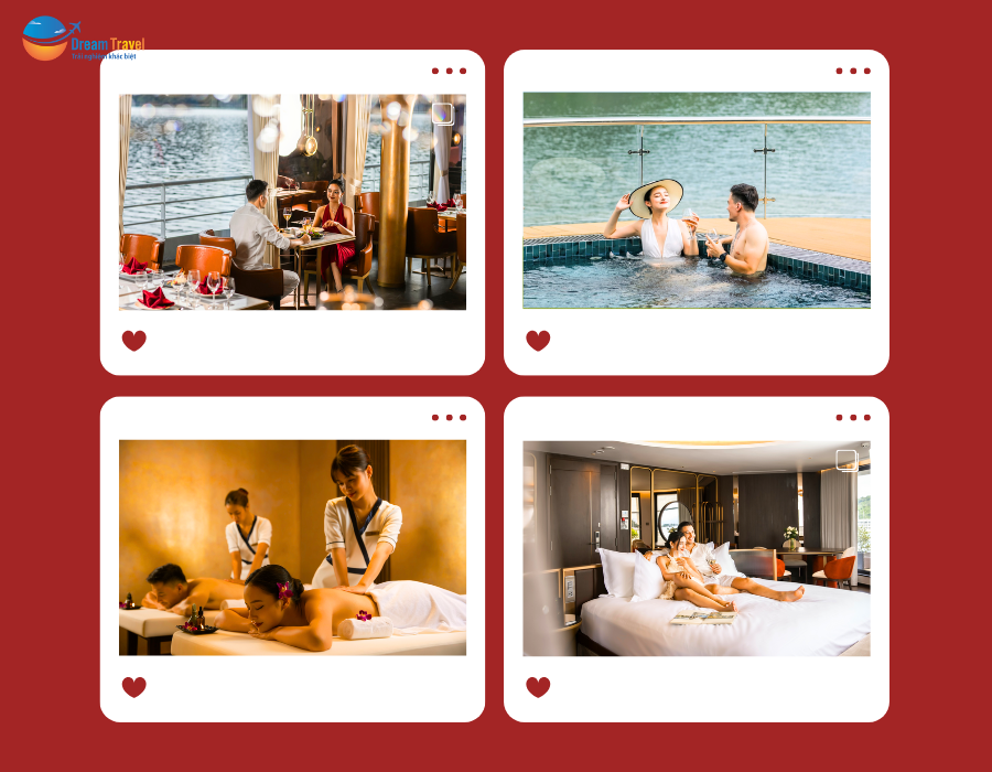 • Ẩm thực tinh tế: Các món ăn trên du thuyền được chế biến bởi các đầu bếp chuyên nghiệp, mang đến những hương vị đặc sắc của ẩm thực Việt Nam và quốc tế.