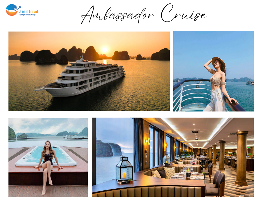 Đây là du thuyền 5 sao đẳng cấp mang đến nhiều trải nghiệm dành cho du khách với dịch vụ chuyên nghiệp, hành trình khám phá Vịnh Hạ Long độc đáo, thực đơn tôm hùm đẳng cấp cùng nhiều góc check-in ấn tượng.Du thuyền Ambassador Cruise II có chiều dài 90m, rộng 16m và có 5 tầng tiện tích, bao gồm bể bơi, nhà hàng, spa, sundeck đôi, mũi cầu kính,… mang đến không gian nghỉ dưỡng bậc nhất cho du khách trong hành trình khám phá Hạ Long trong ngày.Với 2 nhà hàng rộng rãi cùng khu vực boong tàu kép, Ambassador Cruise II đã tạo nên không gian ấn tượng, nâng tầm trải nghiệm thư giãn, nghỉ dưỡng và ngắm nhìn cảnh đẹp của Vịnh Hạ Long lên một tầng cao mới.