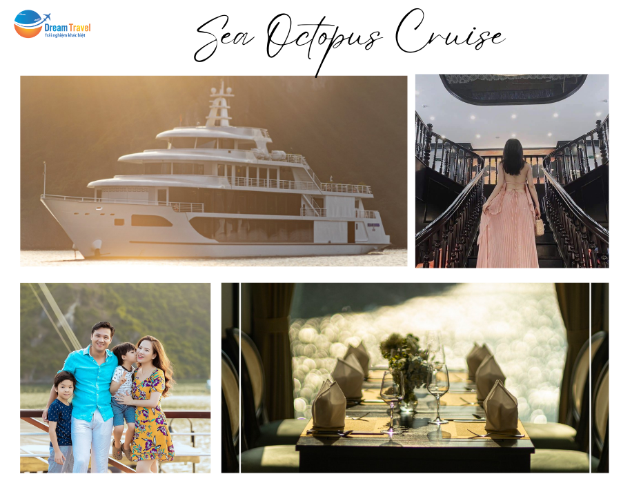 Sea Octopus là du thuyền có chiều dài lên đến 70m, sức chứa tối đa 280 khách. Với không gian rộng lớn cùng với dịch vụ tiện ích đẳng cấp, xa hoa, con tàu này đã được gọi với cái tên vô cùng thân thương: “Bạch tuộc sắt khổng lồ” – đúng với cái tên “Octopus”. Không chỉ là du thuyền nhà hàng thông thường, Sea Octopus còn đáp ứng đầy đủ nhu cầu của các nhóm khách hàng, từ trẻ em cho đến người lớn, người lớn tuổi với 2 nhà hàng lớn, 3 phòng ăn VIP, phù hợp dành cho các cặp đôi, gia đình, nhóm bạn hoặc các vị khách VIP từ các Tập đoàn lớn trên thế giới. Nhằm tối ưu hóa trải nghiệm của các du khách, Sea Octopus đã được thiết kế với 4 boong trên tàu, đưa bạn chạm gần hơn đến cảnh đẹp hùng vĩ của di sản thiên nhiên thế giới. Đặc biệt, ở khu vực Bar & Lounge, bạn sẽ được “bung hết sức mình” với dàn âm thanh ánh sáng, DJ chuyên nghiệp. Đây cũng chính là điểm độc đáo mà có khá ít du thuyền sở hữu.