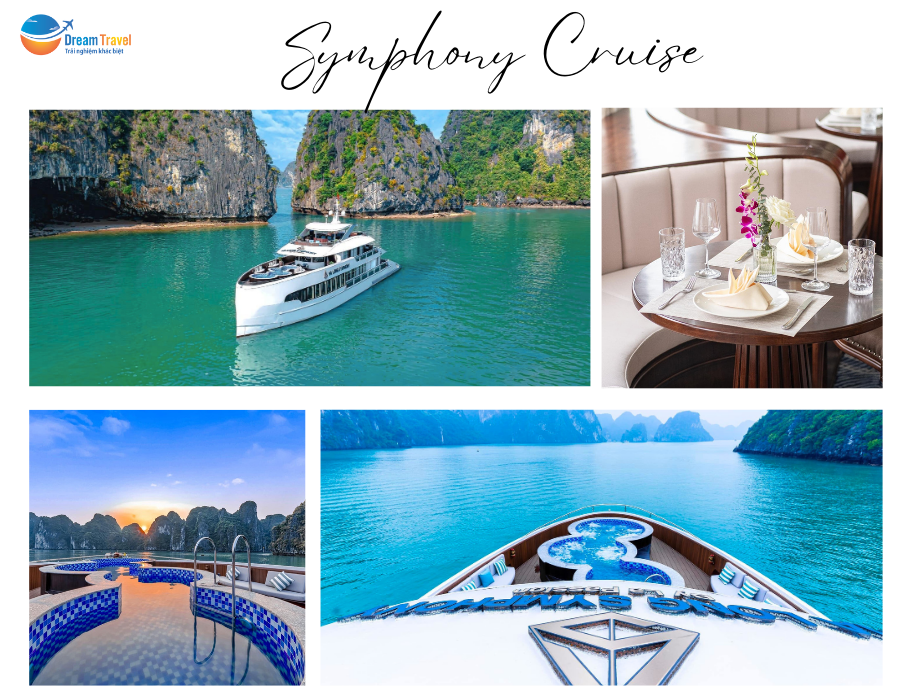 Du thuyền Symphony là du thuyền mới với kiểu dáng hiện đại, sang trọng như một du thuyền phương Tây. Từ bên ngoài nhìn vào du thuyền mang dáng vẻ hiện đại của một du thuyền cá nhân sang trọng. Bên trong du thuyền có nhà hàng phục vụ bữa ăn buffet trưa. Điểm độc đáo của du thuyền với 2 bể sục, 1 bể hình zic zic trên tầng 2 phía mũi du thuyền và 1 bể phía sau để khách hàng có nhiều không gian hơn tận hưởng trong chuyến đi.