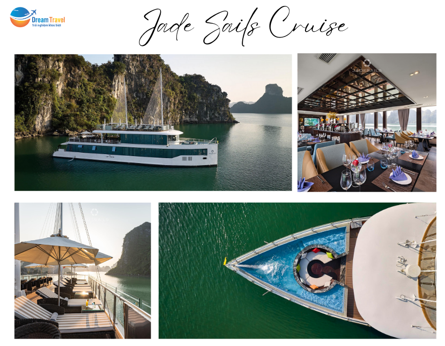 Jade Sails du thuyền 5 sao có hành trình du ngoạn đến cả hai vịnh đẹp nhất tại vùng Bắc Bộ: Vịnh Hạ Long và Lan Hạ. Tàu sở hữu thiết kế sang trọng, ấm cúng cùng hệ thống an ninh nên luôn đảm bảo an toàn cho mọi du khách trên tàu. Nội thất và các chi tiết thiết kế trên du thuyền Jade Sails mang vẻ đẹp hài hòa giữa văn hóa Việt Nam và phong cách châu âu, mang đến một vẻ đẹp rất riêng, độc đáo và thú vị hơn so với các du thuyền khác. Không gian của du thuyền cũng được đầu tư chỉn chu, kỹ lưỡng với nhiều dịch vụ tiện ích, sang trọng và đẳng cấp như nhà hàng ngoài trời/trong nhà, bàn ngồi trong nhà, quầy bar/phòng chờ, ghế dài, hiên tắm nắng,…