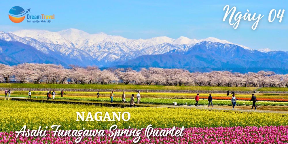 Mùa xuân đã đến dọc theo sông Asahi Funakawa, Hoa anh đào đang nở rộ và bạn có thể thưởng thức “Bộ tứ mùa xuân” trên nền núi và tuyết. Niềm vui ngắm hoa anh đào được nhân đôi với hoa cải và hoa tulip